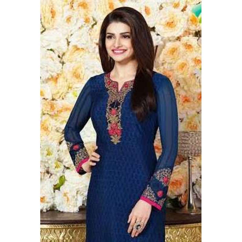 Asian Couture presents latest styles for you modelled by Prachi Desai. Georgette straight cut style suit modeled by prachi desai. this dress is beautified with zari, sequins, embroidered patch work at bottom and neck of the kameez.The mesmerizing style is made in Soft & luxe crepe fabric for you to experience luxury & Royalty. This suit comes with matching crepe material for churidar/salwar and chiffon dupatta .
