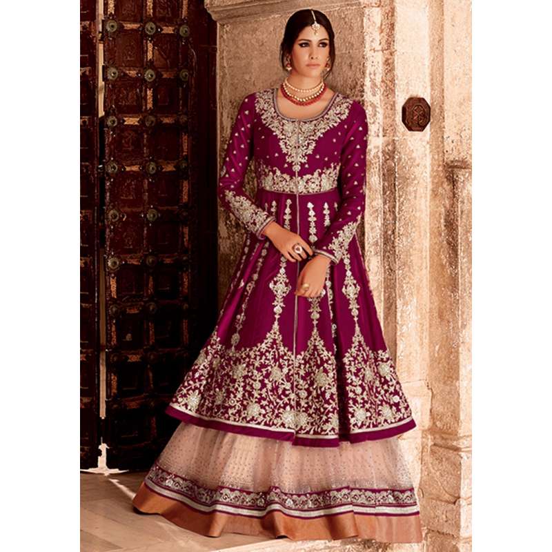 Long Indian Frock style Dress comes in MAGENTA velvet now available stitched and semi stitched frock style kameez designed with Embroidered zari, stone, sequins, work and patch border work. Available with shantoon churidar,velvet sleeves fabric and matching bordered chiffon dupatta.