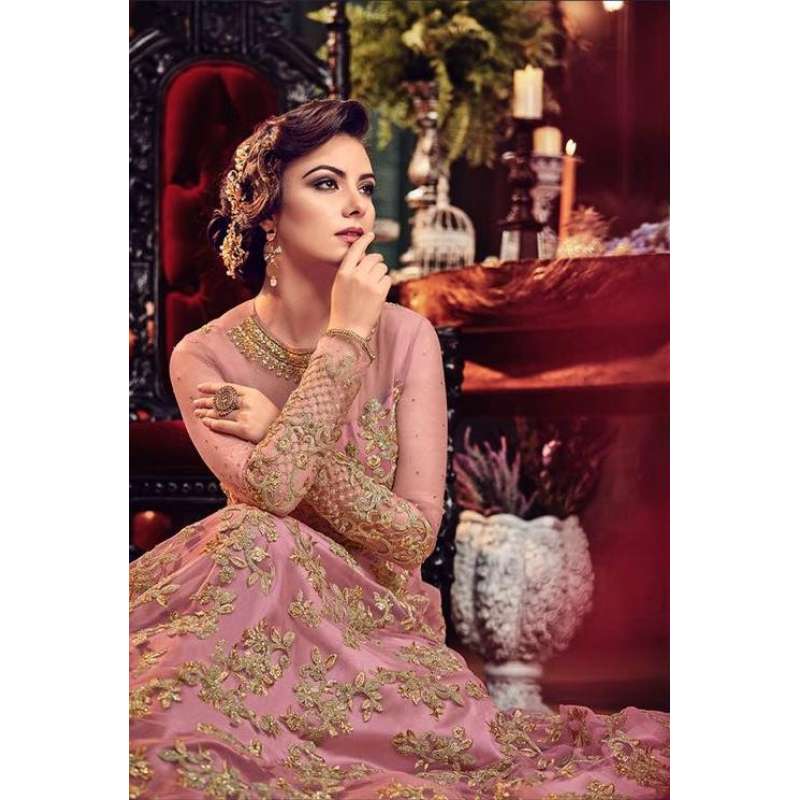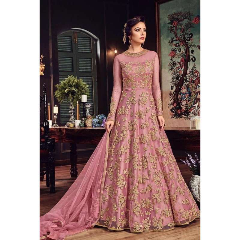 Pink Semi stitched suit in premium net fabric. Satin inner, santoon trouser fabric. Net dupatta. Maximum chest width 44".