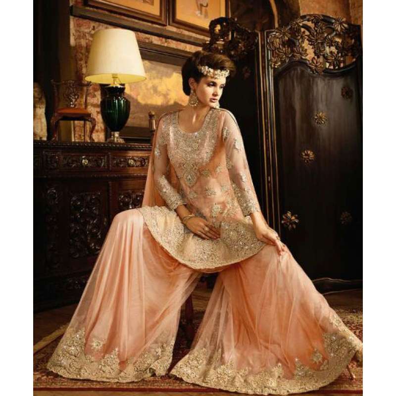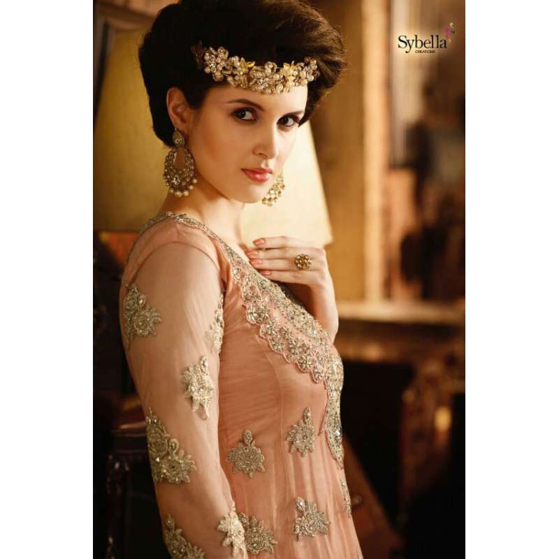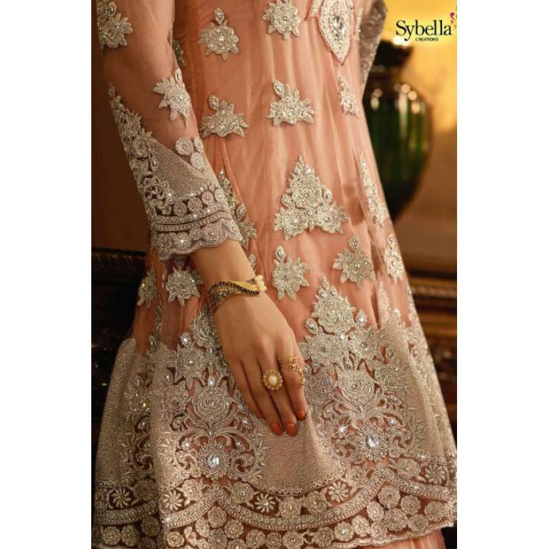 with the rich heritage of Indian aesthetics! Embrace yourself with this peach sybella lehenga dress. Net top, heavy japan satin inner, santoon bottom and nazmin