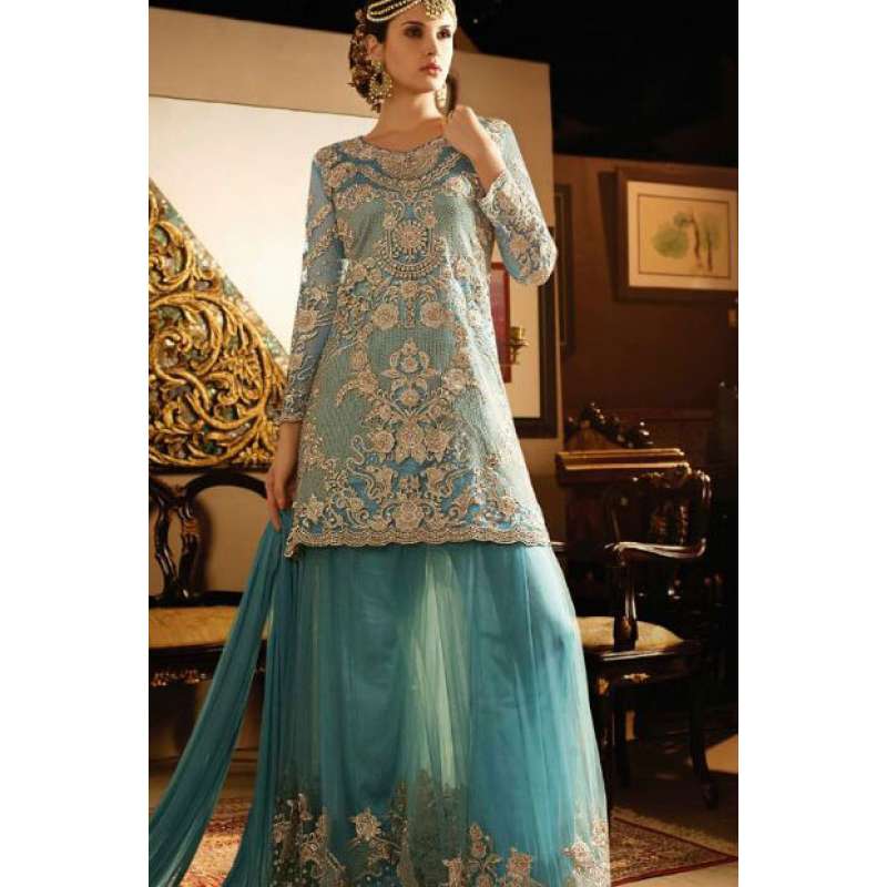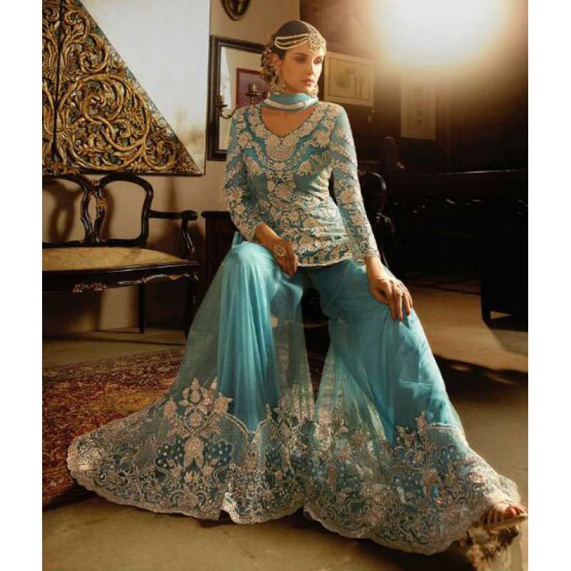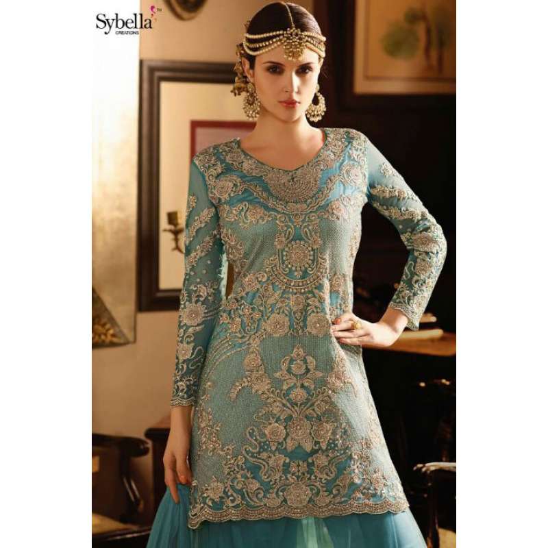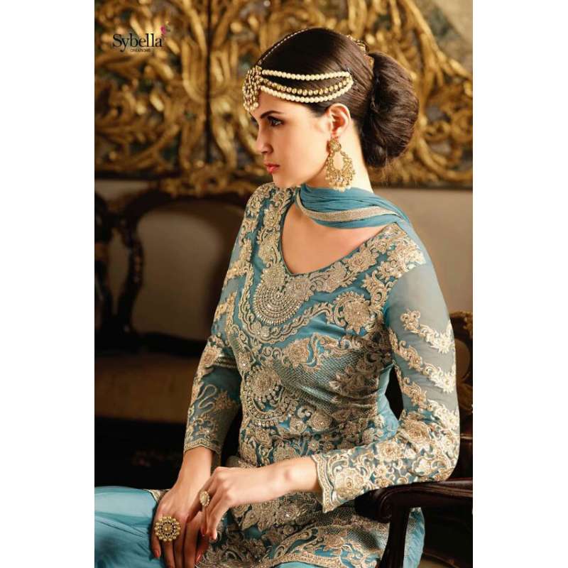 Inspire with the rich heritage of Indian aesthetics! Embrace yourself with this blue sybella dress. Net top, heavy japan satin inner, santoon bottom and nazmin chiffon dupatta.