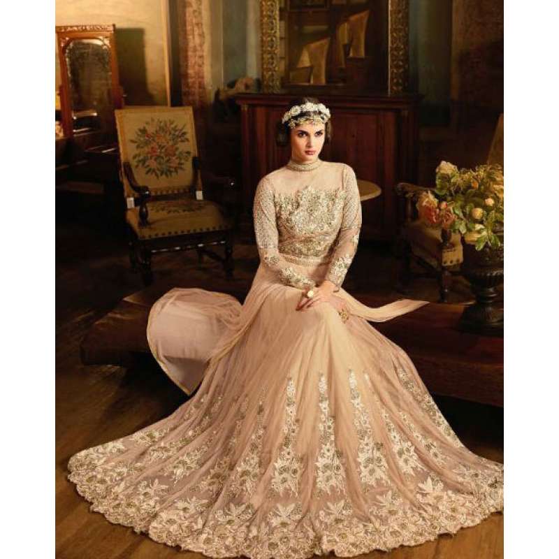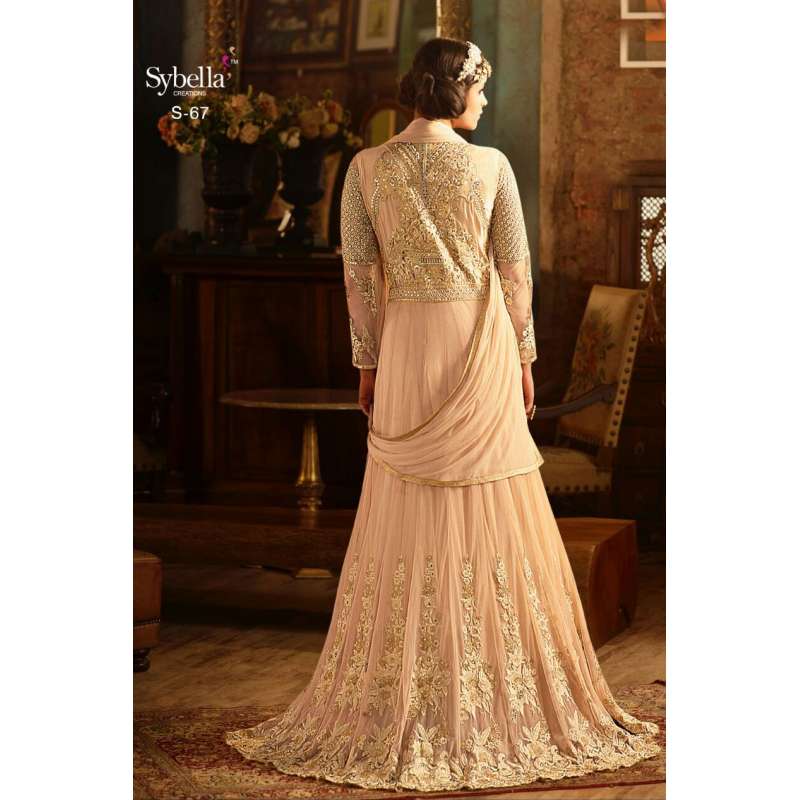 Inspire with the rich heritage of Indian aesthetics! Embrace yourself with this peach sybella lehenga dress. Net top, heavy japan satin inner, santoon bottom and nazmin chiffon dupatta.