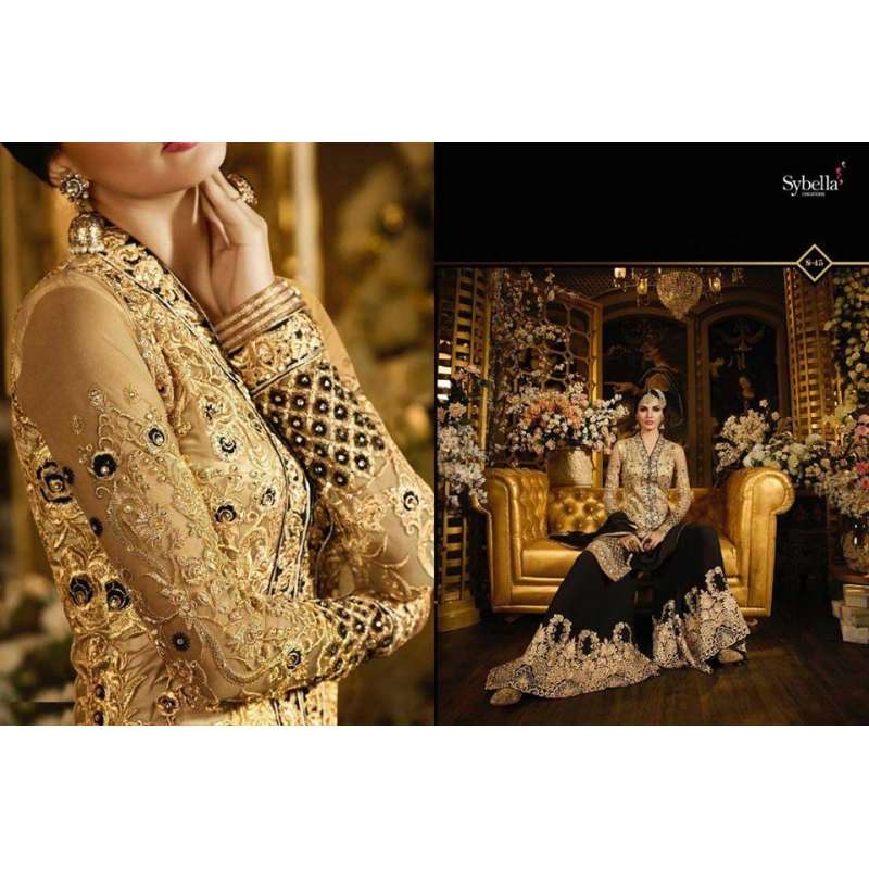 Asian Couture bring you a lush new gold and black blossom sybella designer dress. Stunning, heavy-worked party wear designed with the finest quality semi stitched Fabric with Heavy thread work and embellishments chiffon net dupatta.