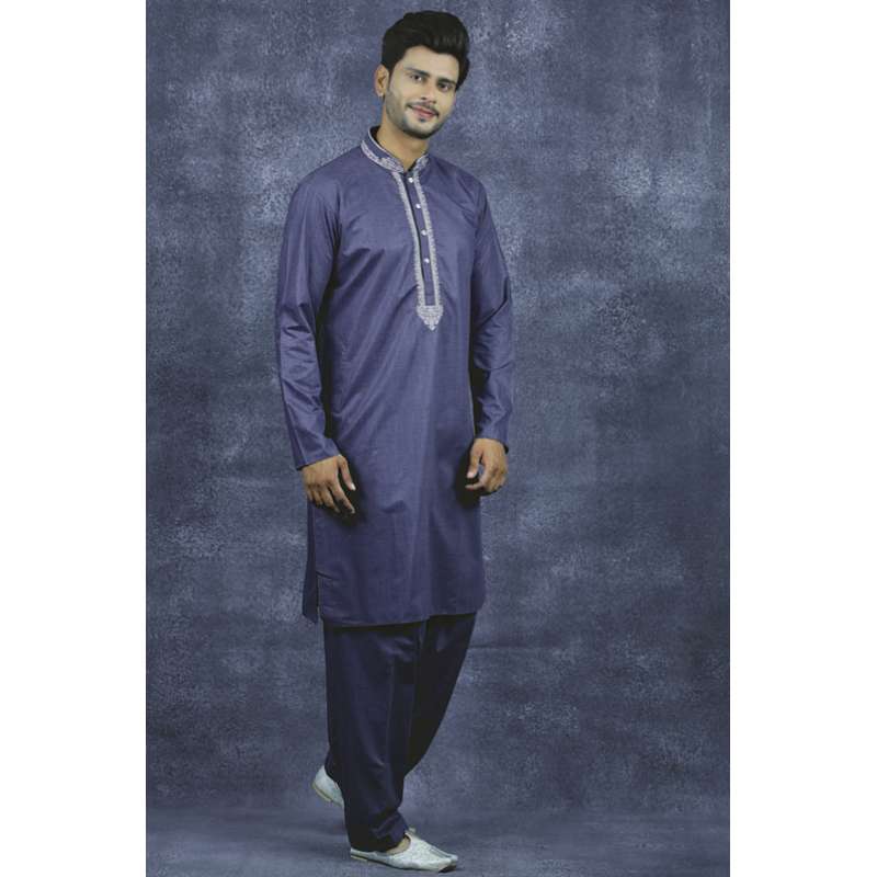 Crafted from Polyester, this piece features an embroidered band collar with silver colored buttons. It comes in grey and navy blue and is paired with the same colored salwar.