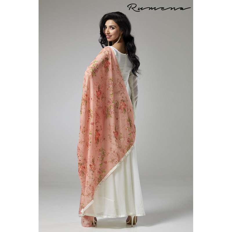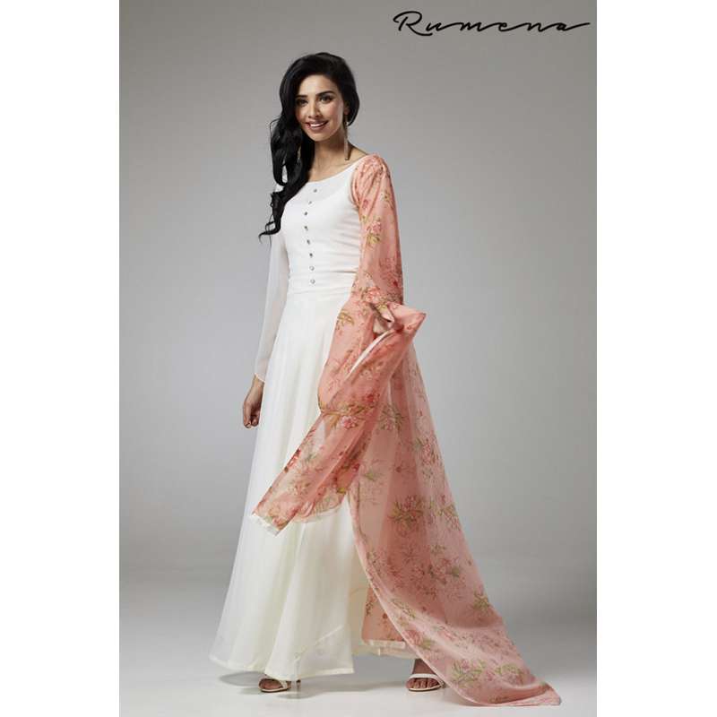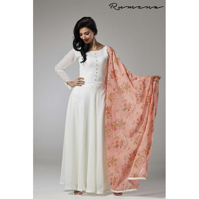 - It is paired with a white churidaar in shantoon and a beautiful floral chiffon dupatta