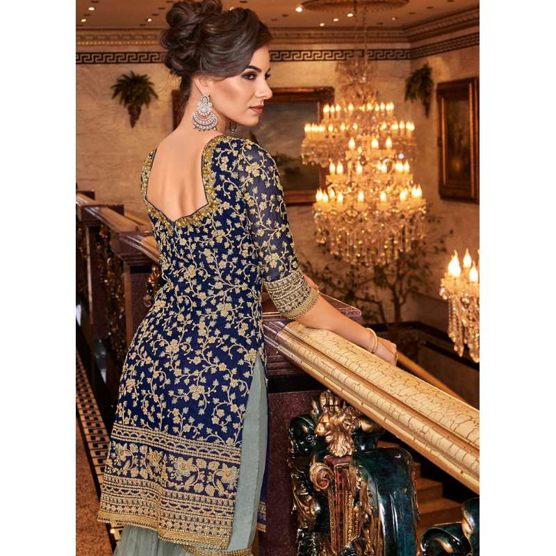 Blue and Grey Embroidered Gharara Suit