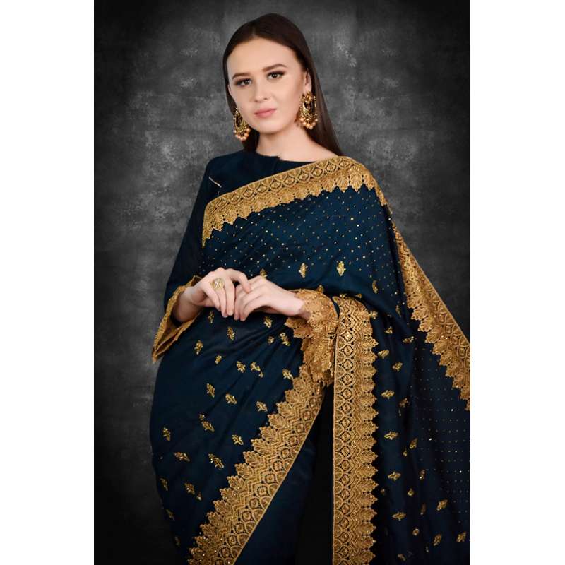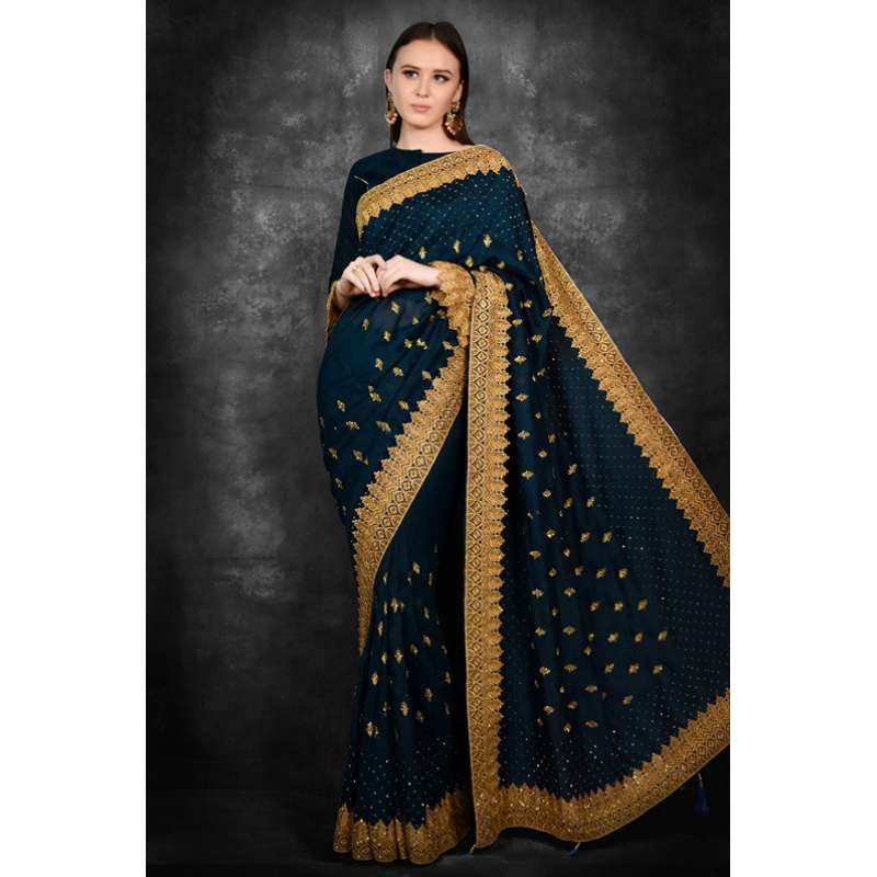 Peacock Blue saree with golden motifs and diamante stonework on all the four sides makes the wearer alluring and attractive. The golden lace borders on the saree as well as on the blouse also give it an aspirational look.
