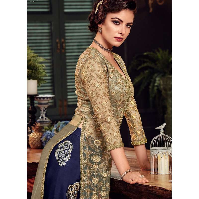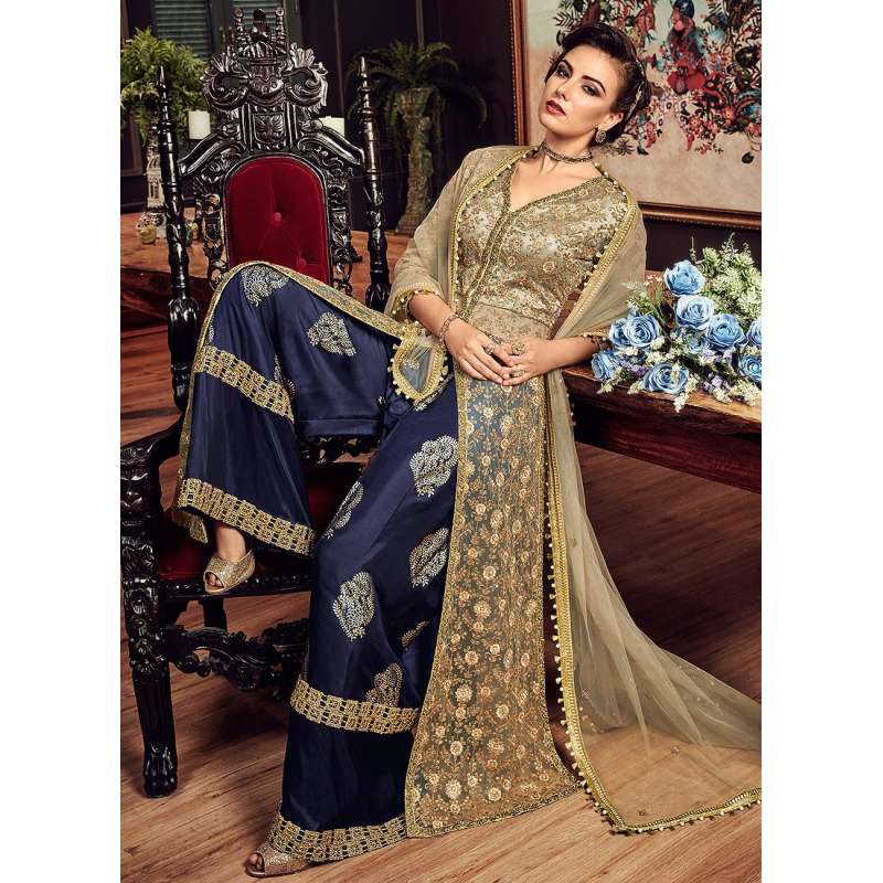 BEIGE AND BLUE HEAVY EMBROIDERED INDIAN WEDDING PALAZZO DRESS