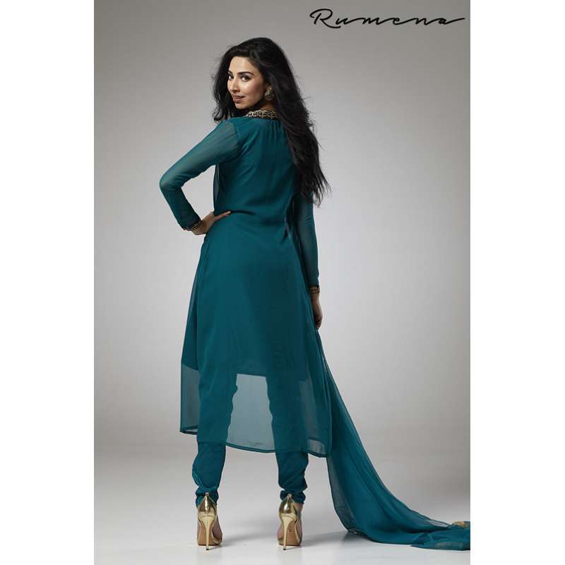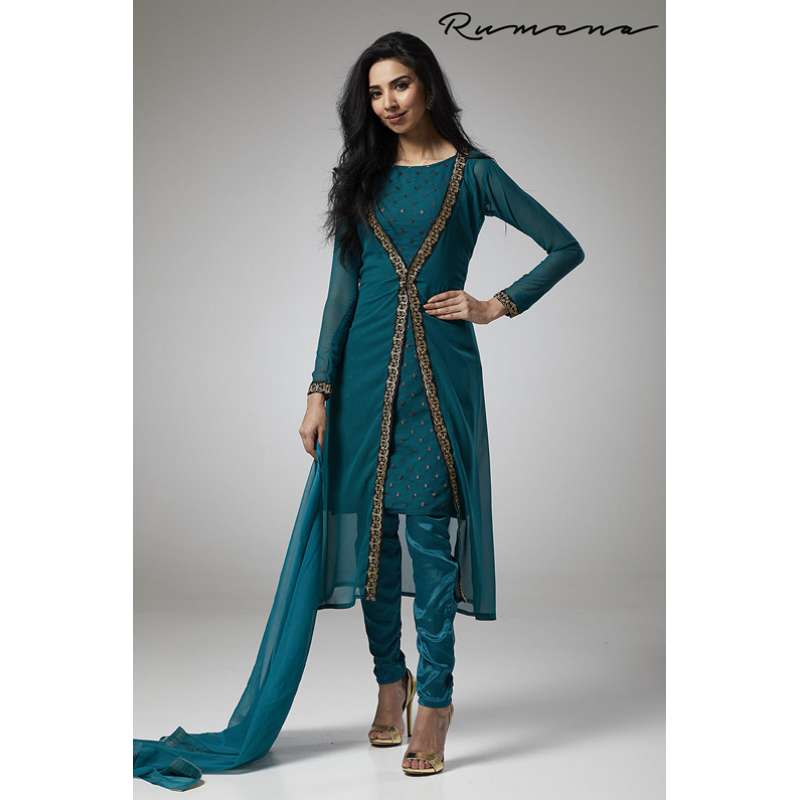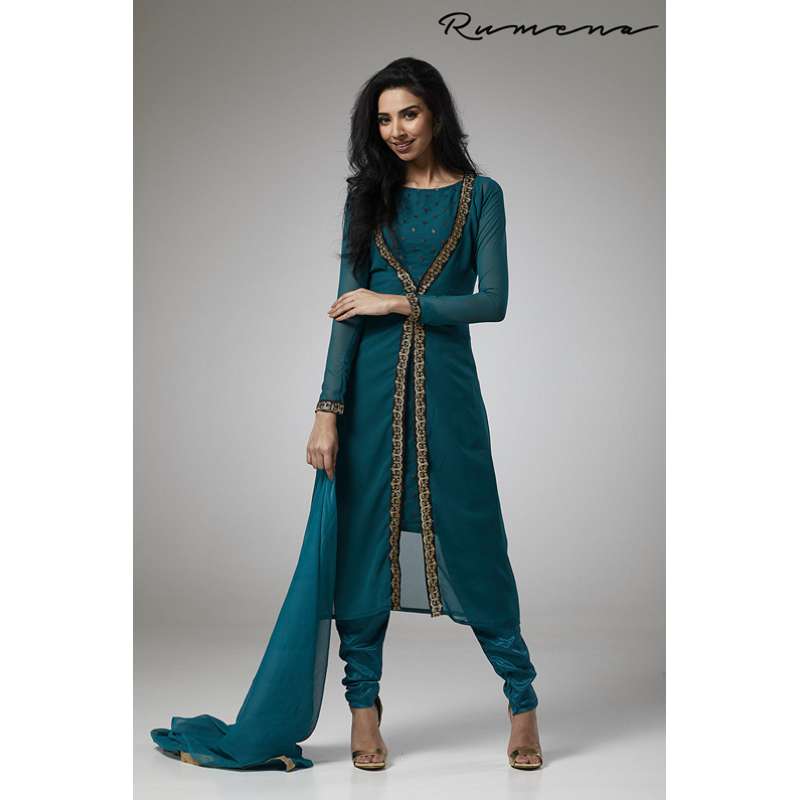 TEAL GREEN JACKET STYLE GEORGETTE READY MADE SUIT
